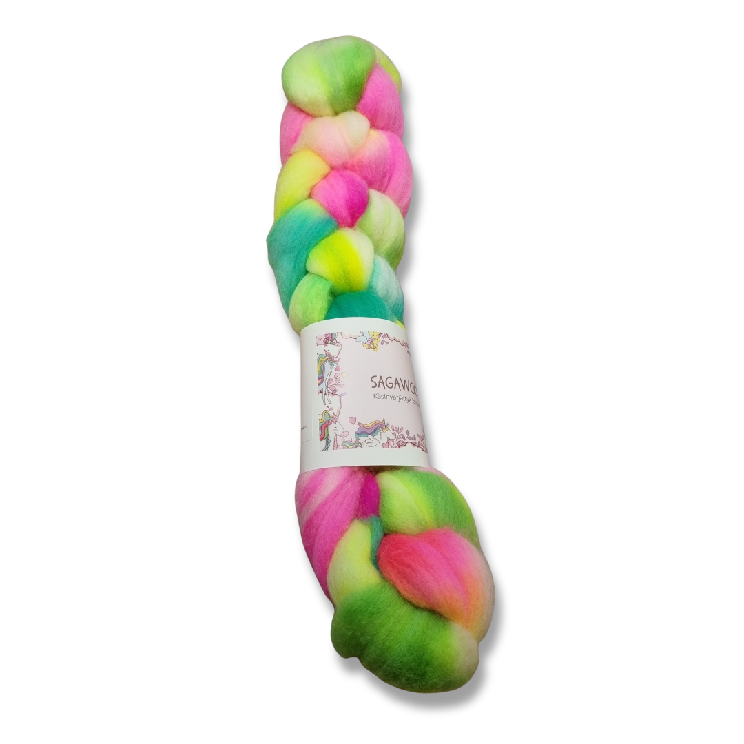 Sagawoolin käsinvärjätyt kehräysvillat tulevat kaikki Iso-Britanniasta. Topsit myydään 50 tai 100g:n leteissä....