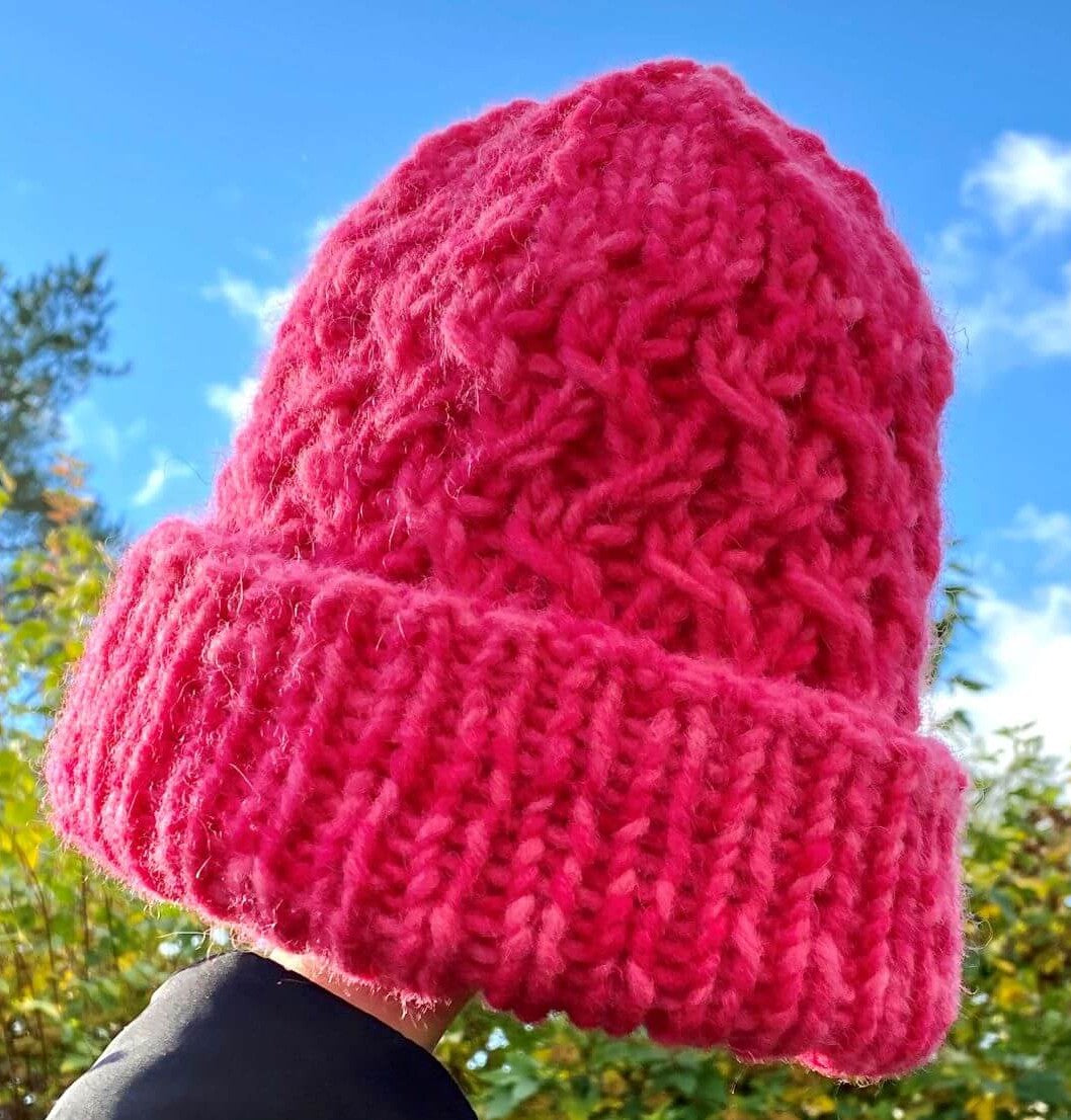 Kuvassa näkyy ohjeen mukaan neulottu muhkea villapipo, jossa yhdistyvät paksu, lämmin villalanka ja kaunis pintaneule. Reilu taitereuna tuo pipoon ryhtiä ja tekee siitä erityisen lämpimän kylmiin päiviin.