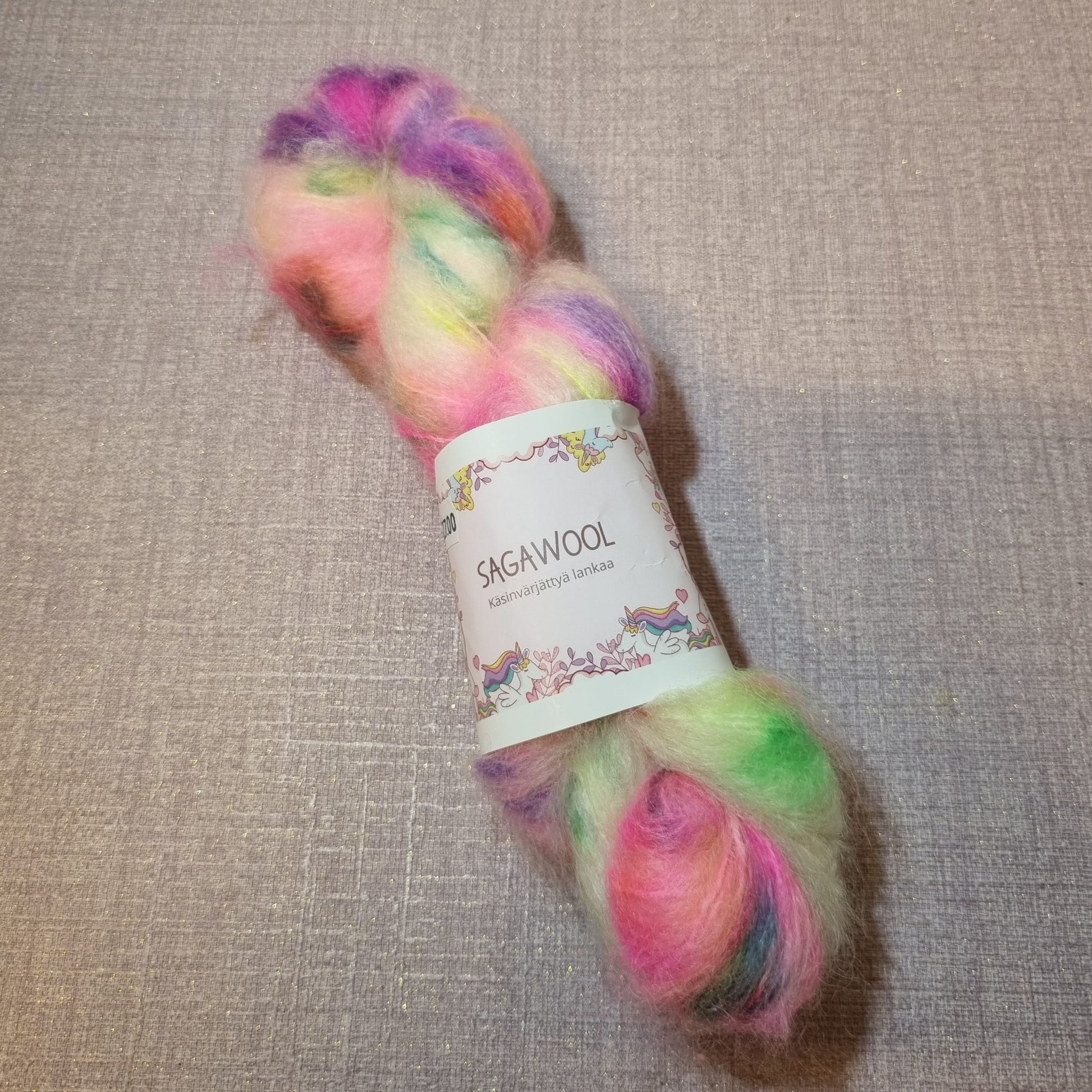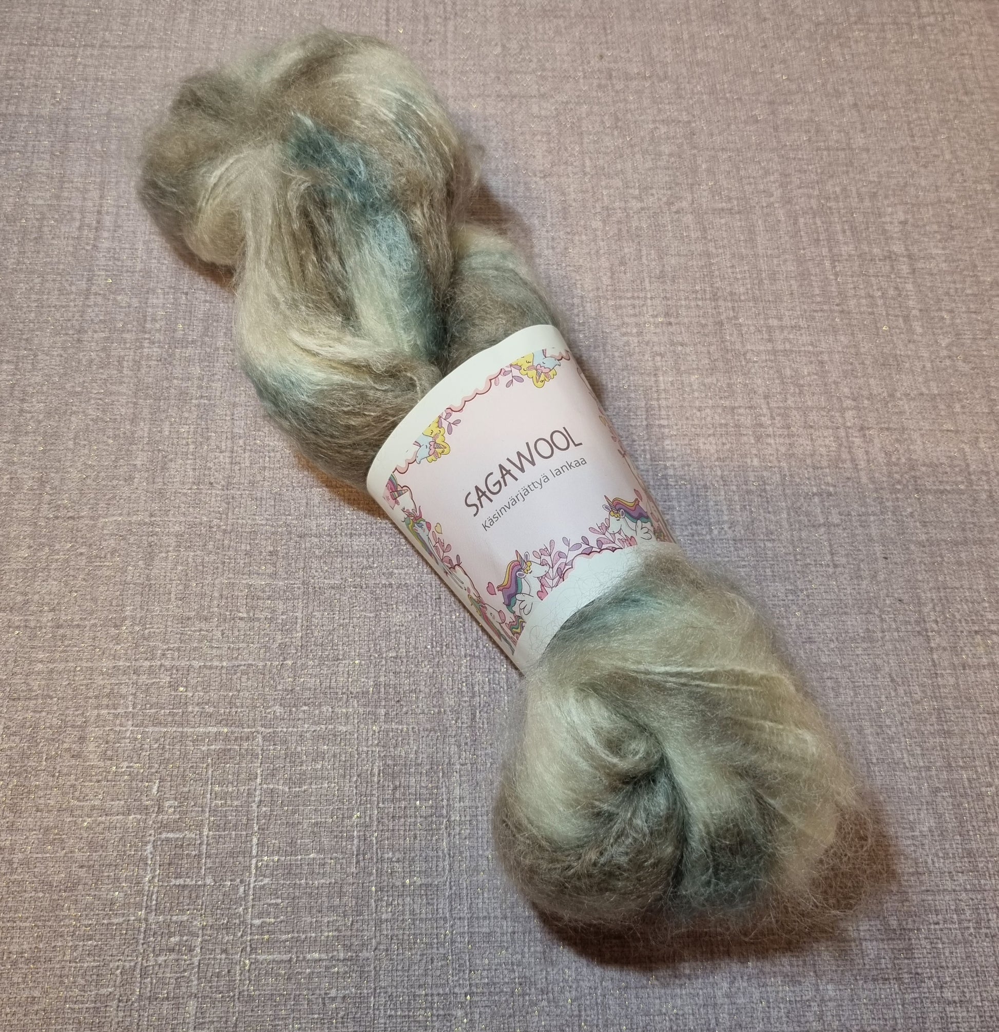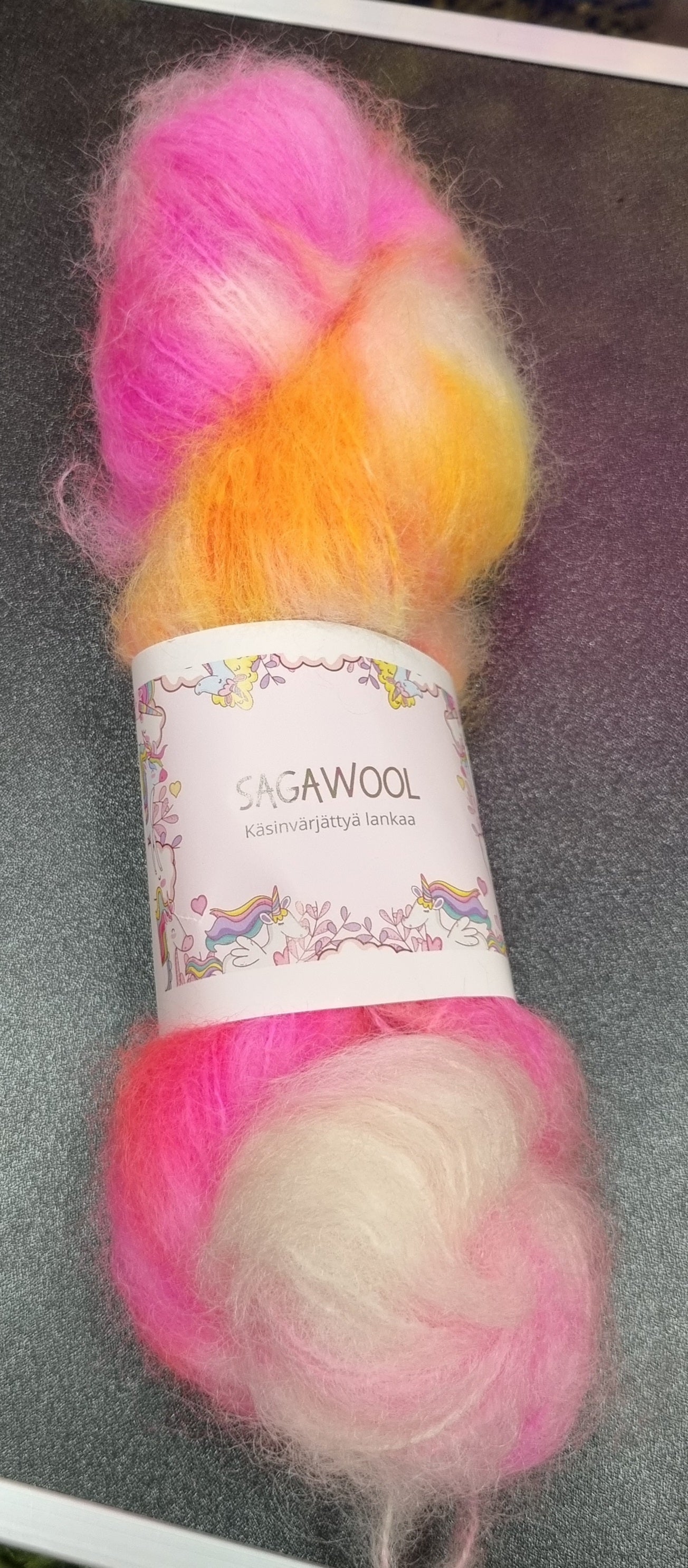 Värjätty käsin ja pesty sen jälkeen villapesuaineella, käsinpesu.