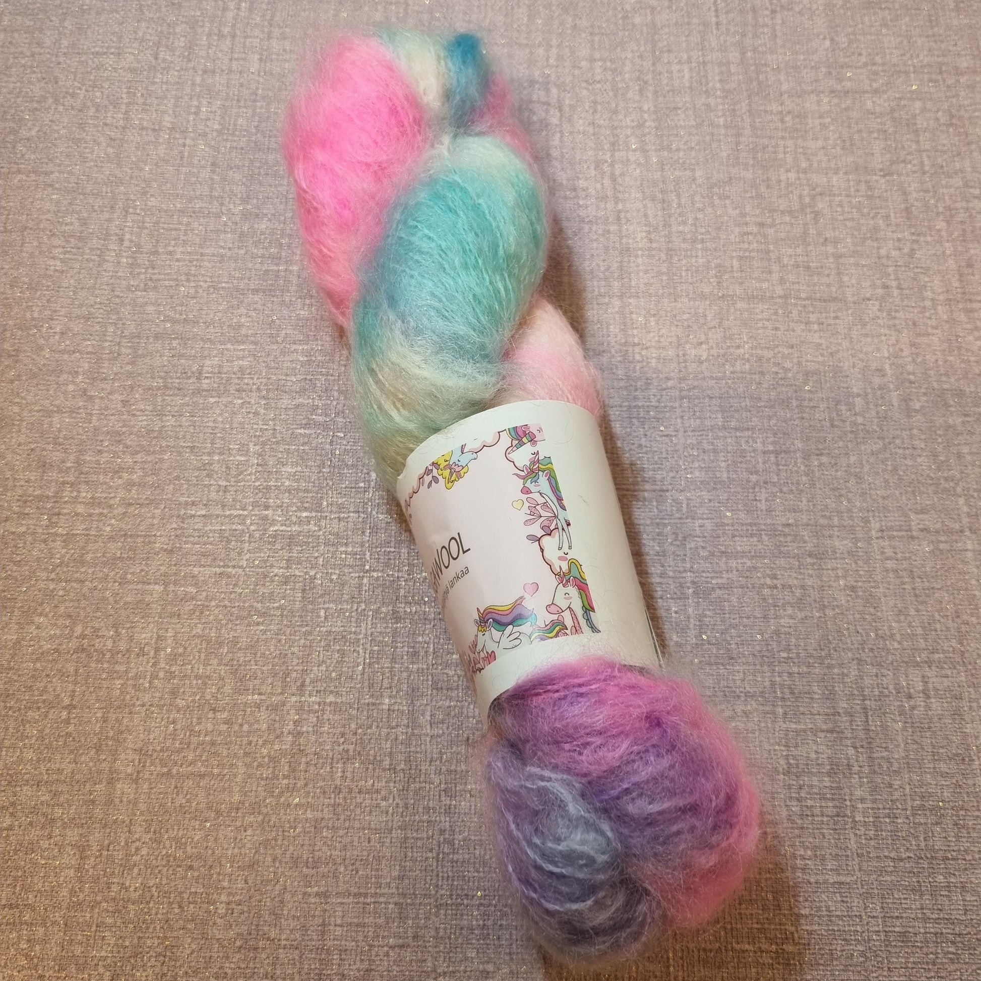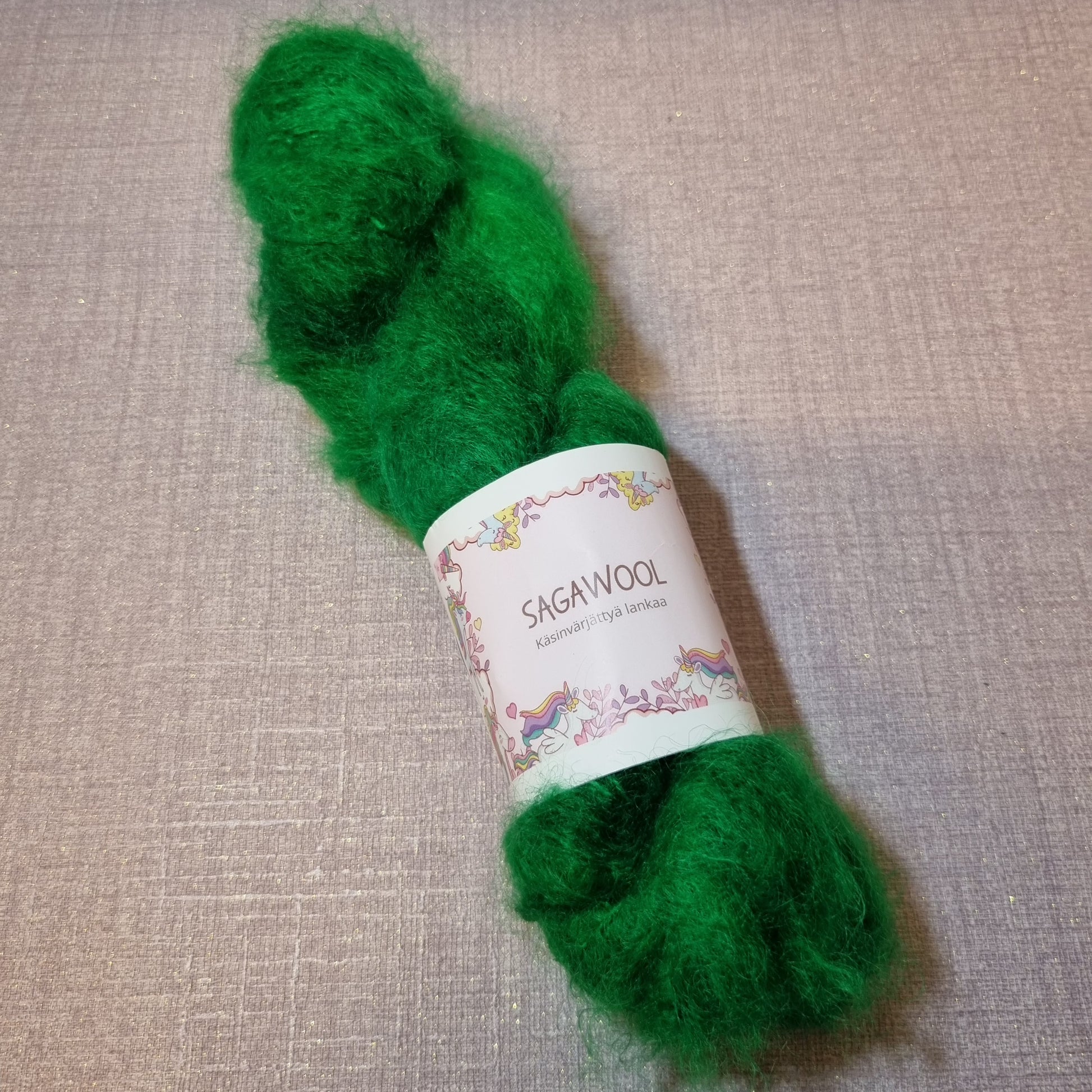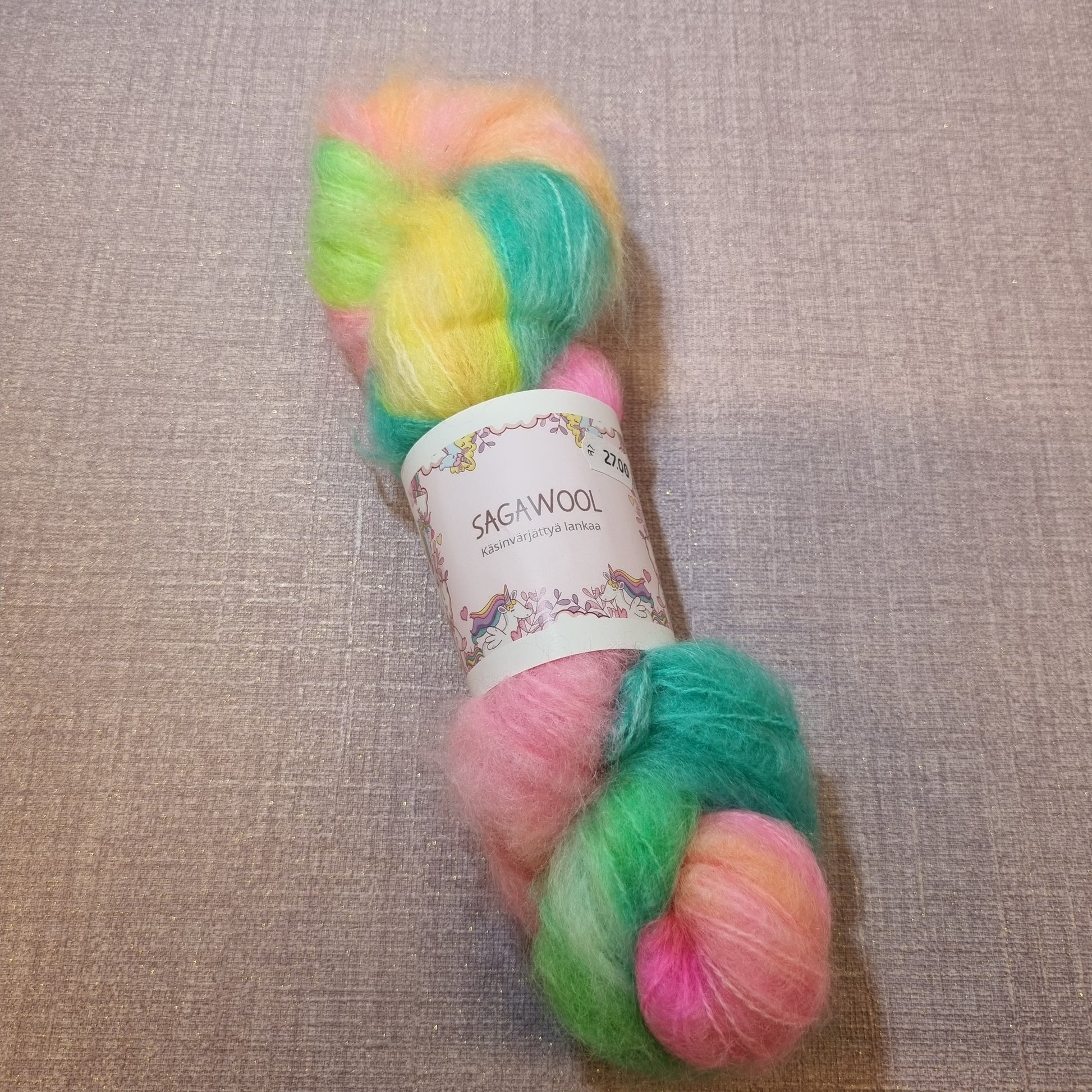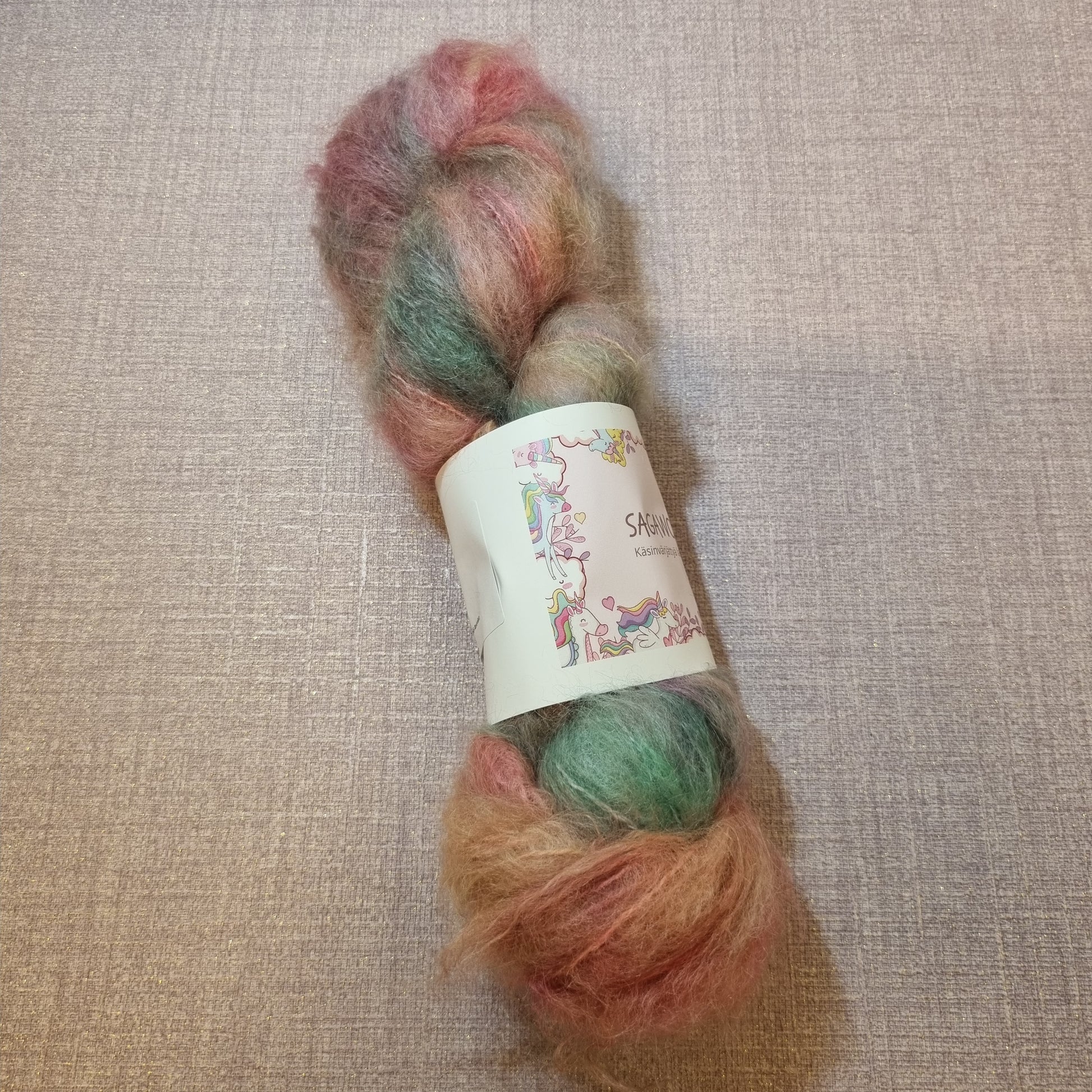Värjätty käsin ja pesty sen jälkeen villapesuaineella, käsinpesu.