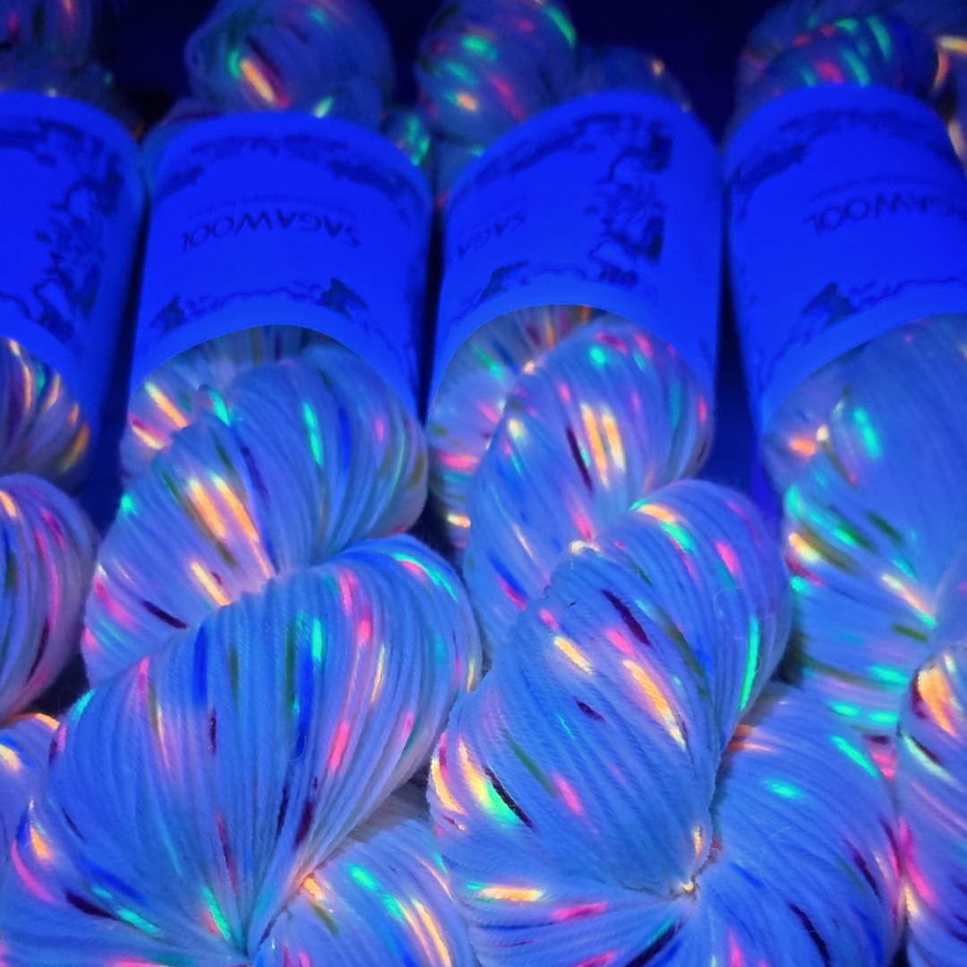Irja merinosock langan uusin värjäys tuttavuus on jännittävä Rainbow Dash, josta löydät kaikki väriympyrän värit. Langan pohjaväri on luonnonvalkoinen ja uv-valossa hohtavat väripilkut on ripoteltu lankaan kuin nonparellit.