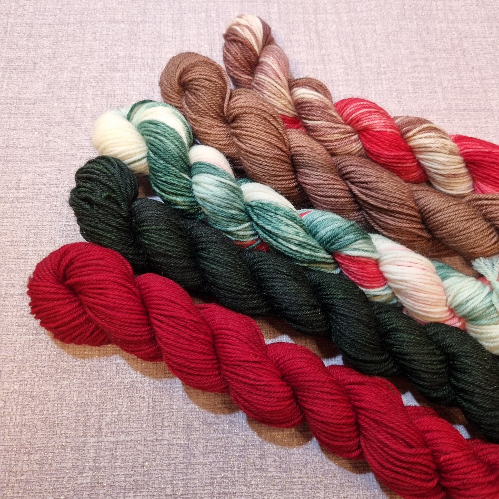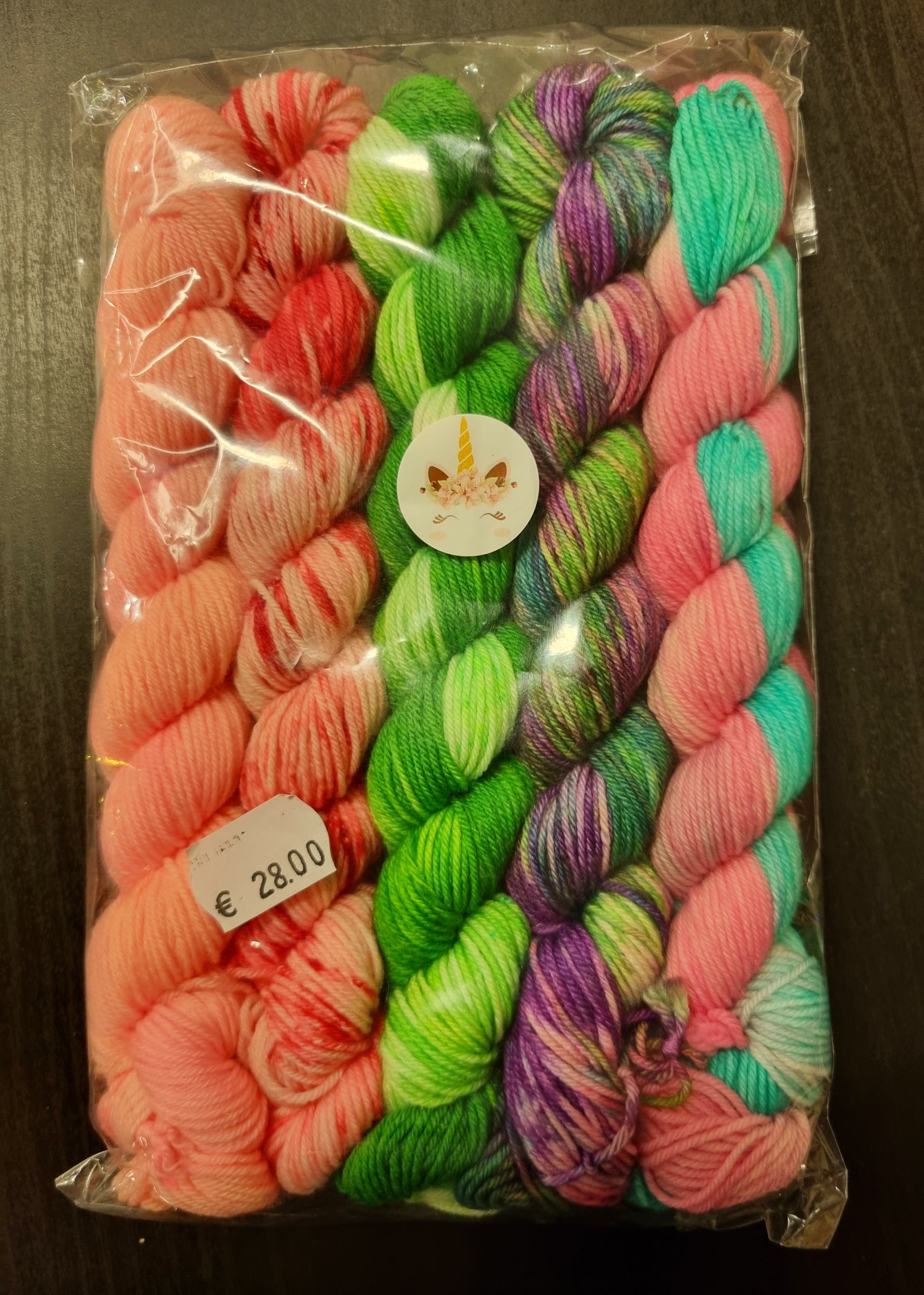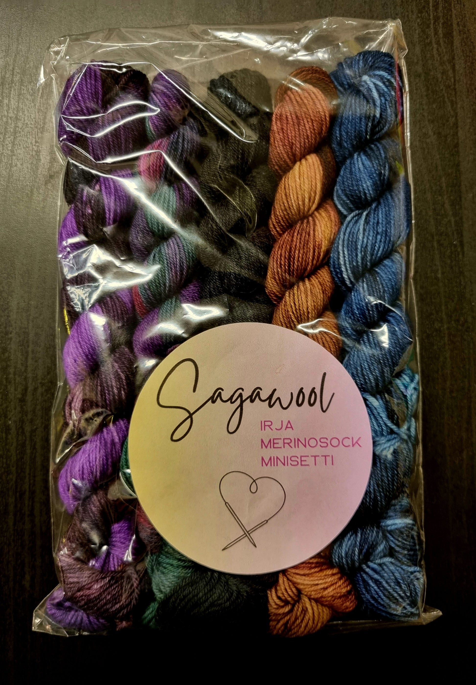 Yhdessä minisetissä on 5kpl Irja merinosock fingering minivyyhtejä. Yhteensä lankaa on siis 100g/420m.
