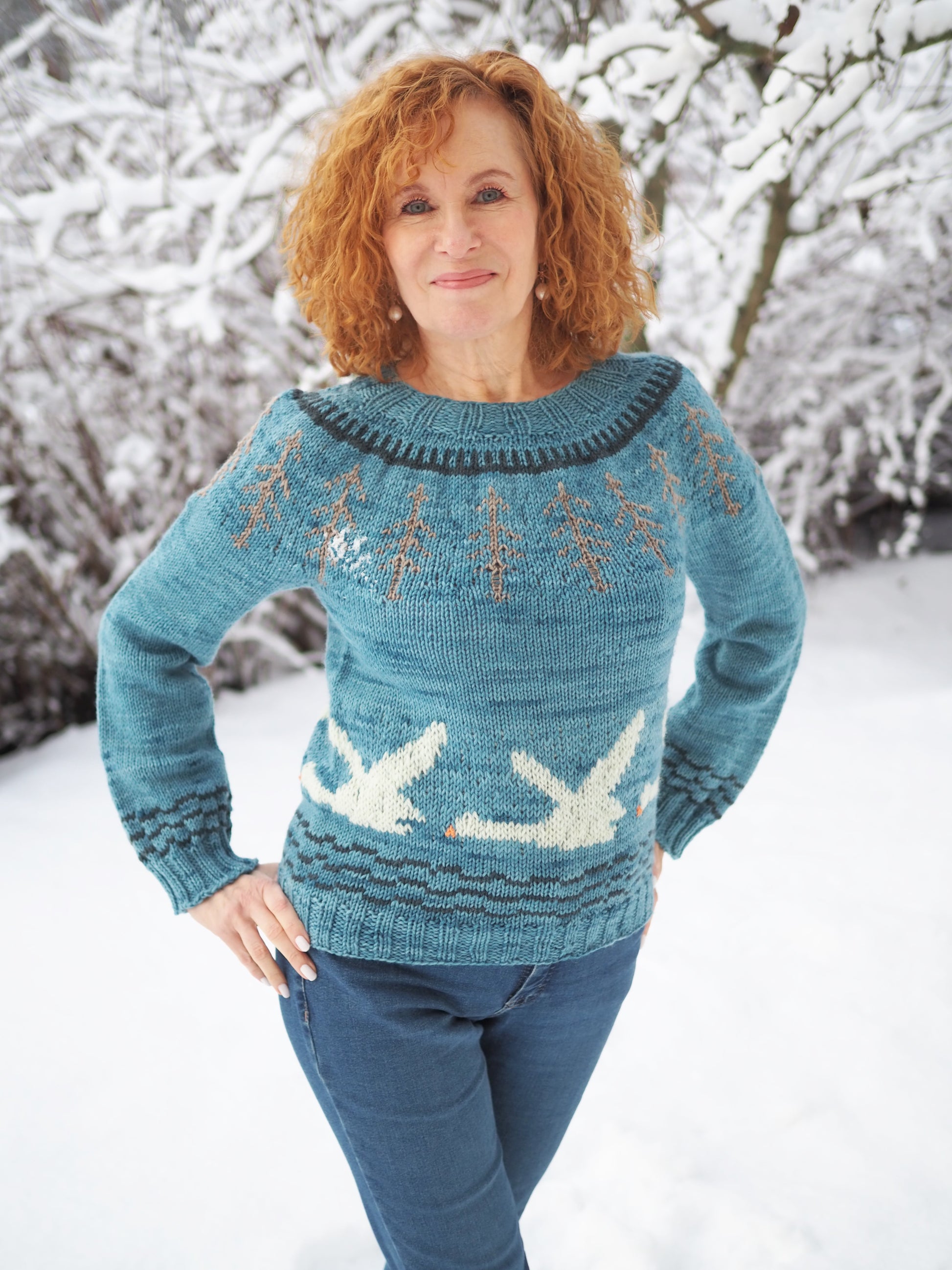 Helmassa lentävät joutsenet meren yllä, nokkien oranssi kuvio silmukoidaan. Kaarrokeneuleen yläosassa järviruokoa teemaan sopien. Neule on mahdollista neuloa myös eri sävyillä.