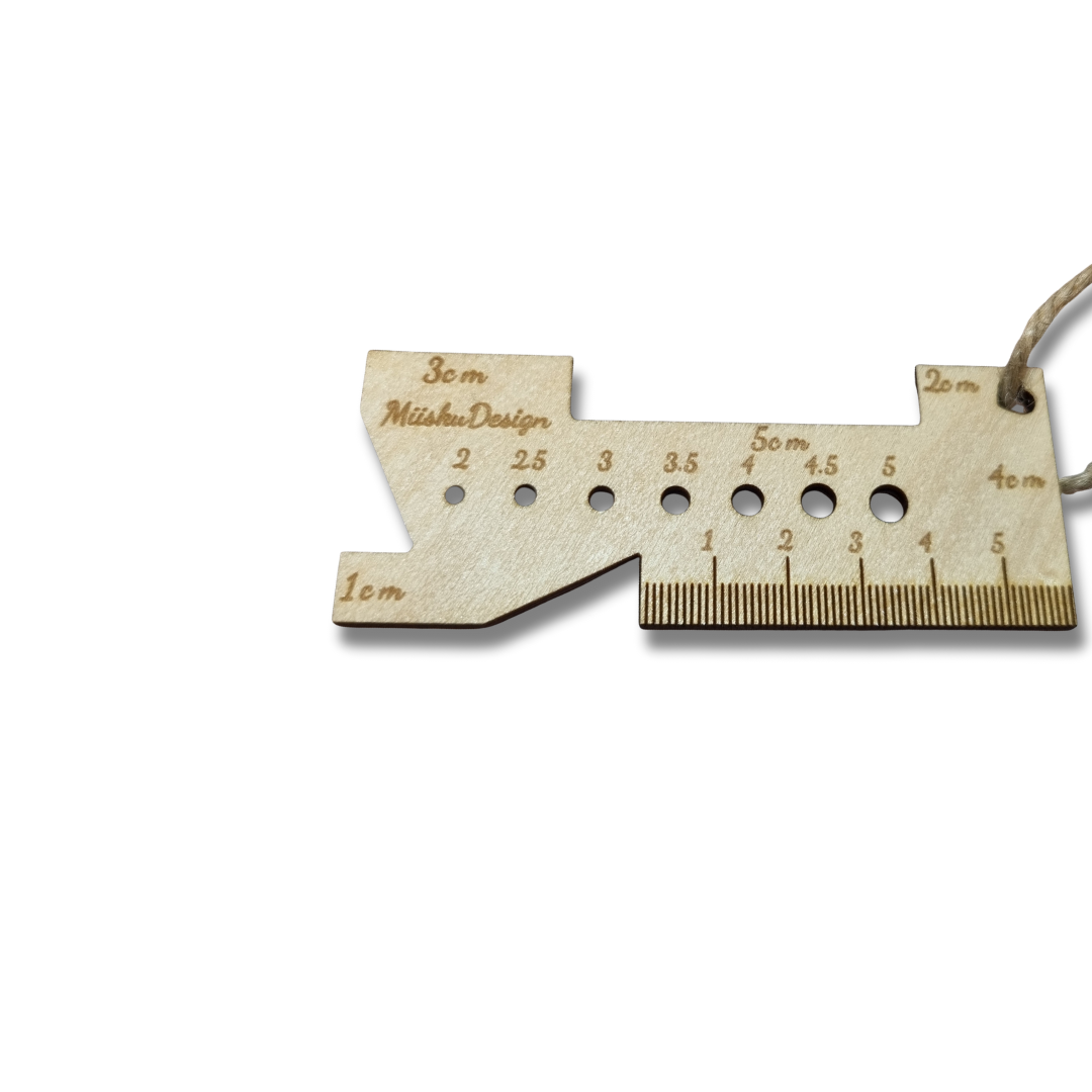 Kotimaisesta koivuvanerista MiiskuDesignin valmistama "mittaliisa" eli saumanvaramitta on kaunis apuväline, jolla mittaat saumanvarat, käänteet, napinlävet, yms. Käy myös kangaspuilla kudonnan mittavälineeksi.