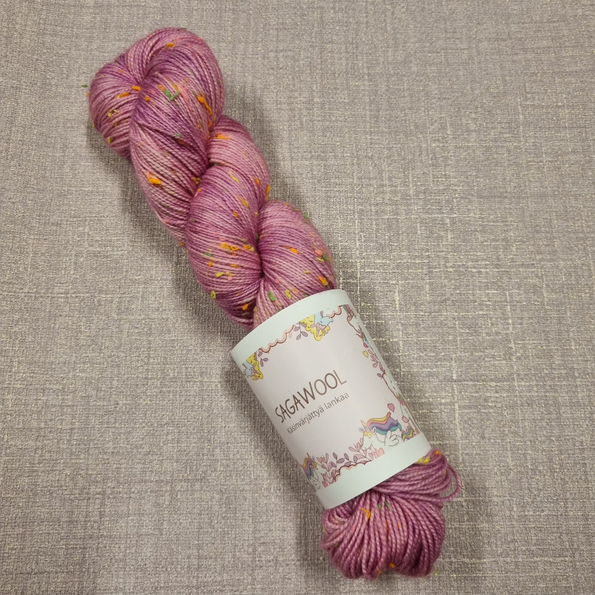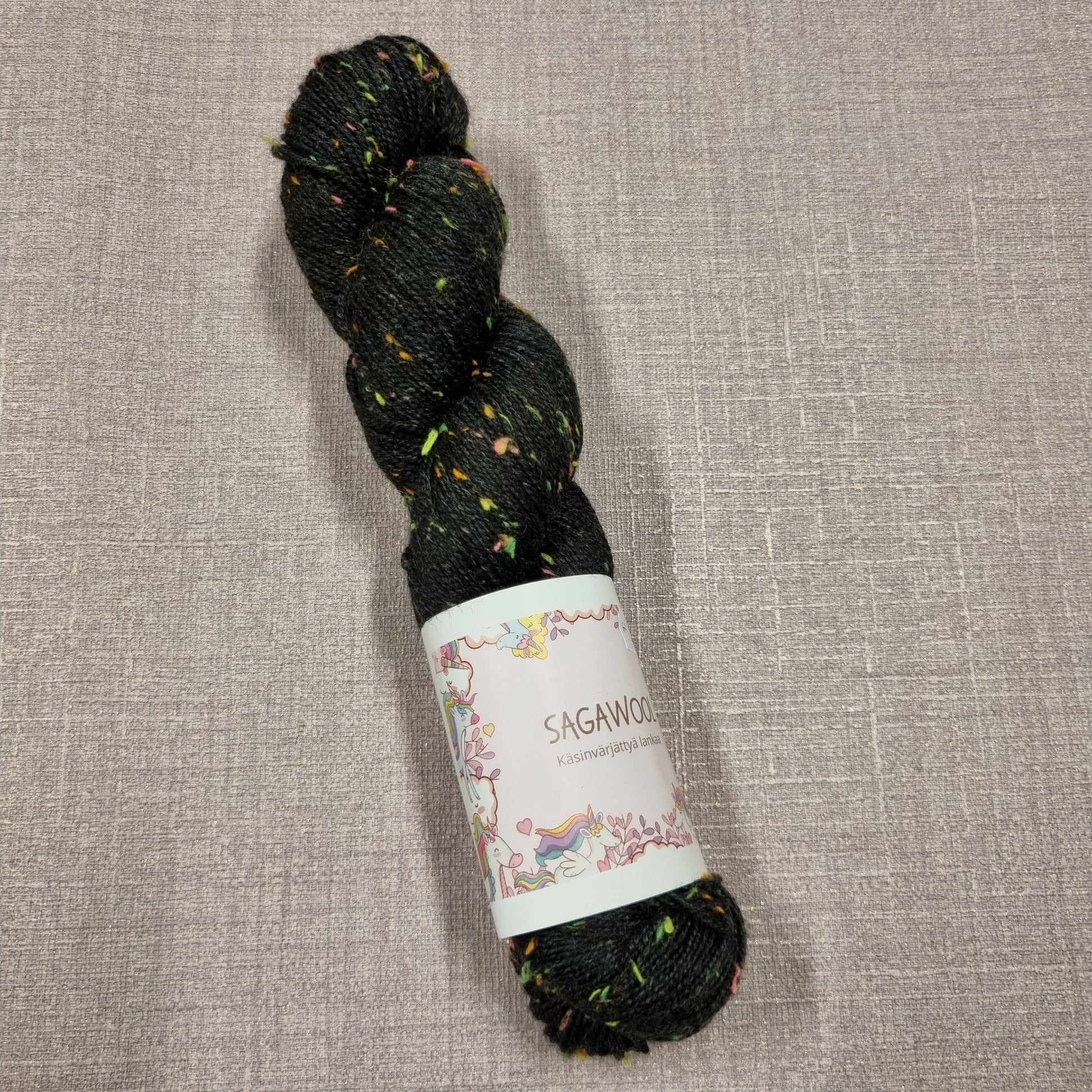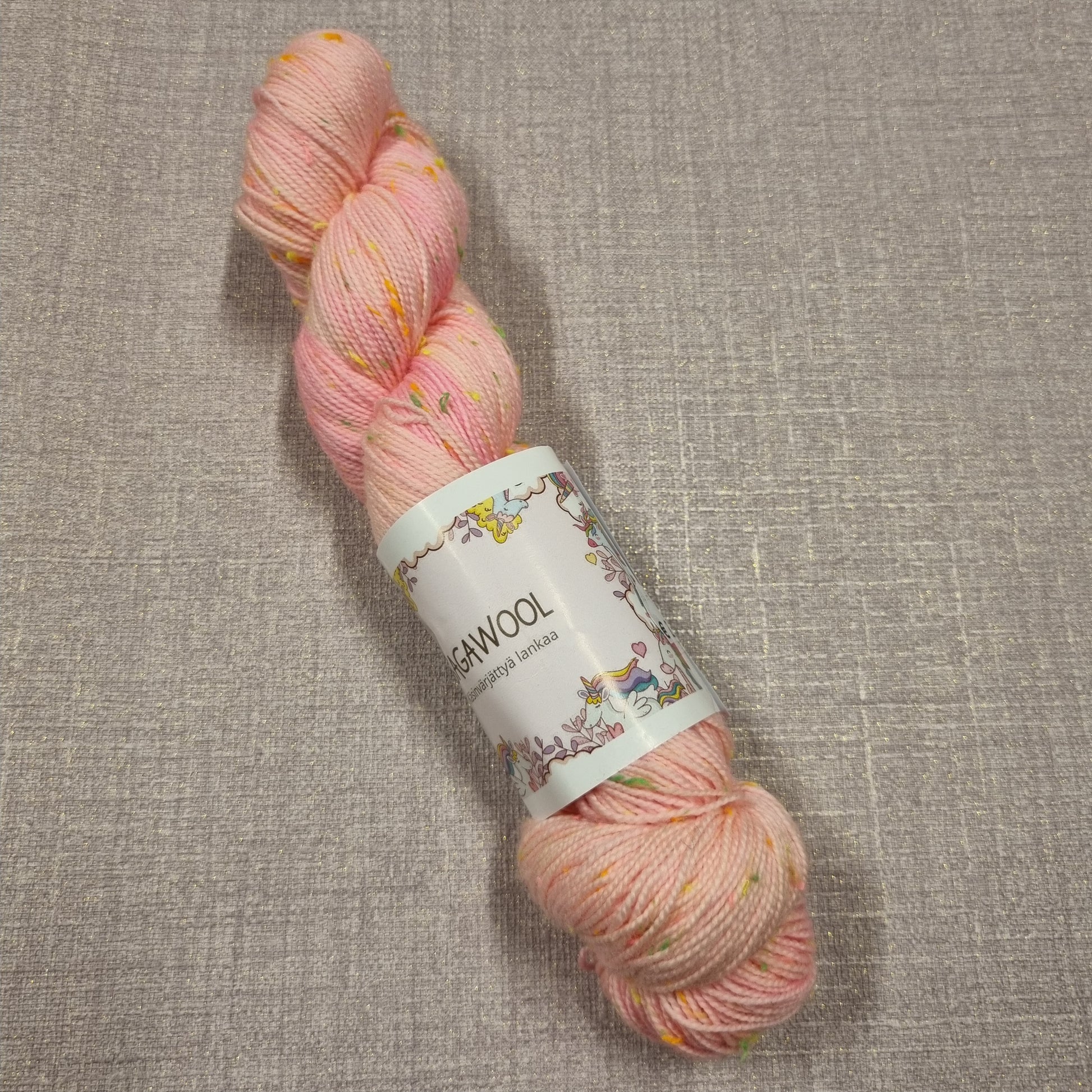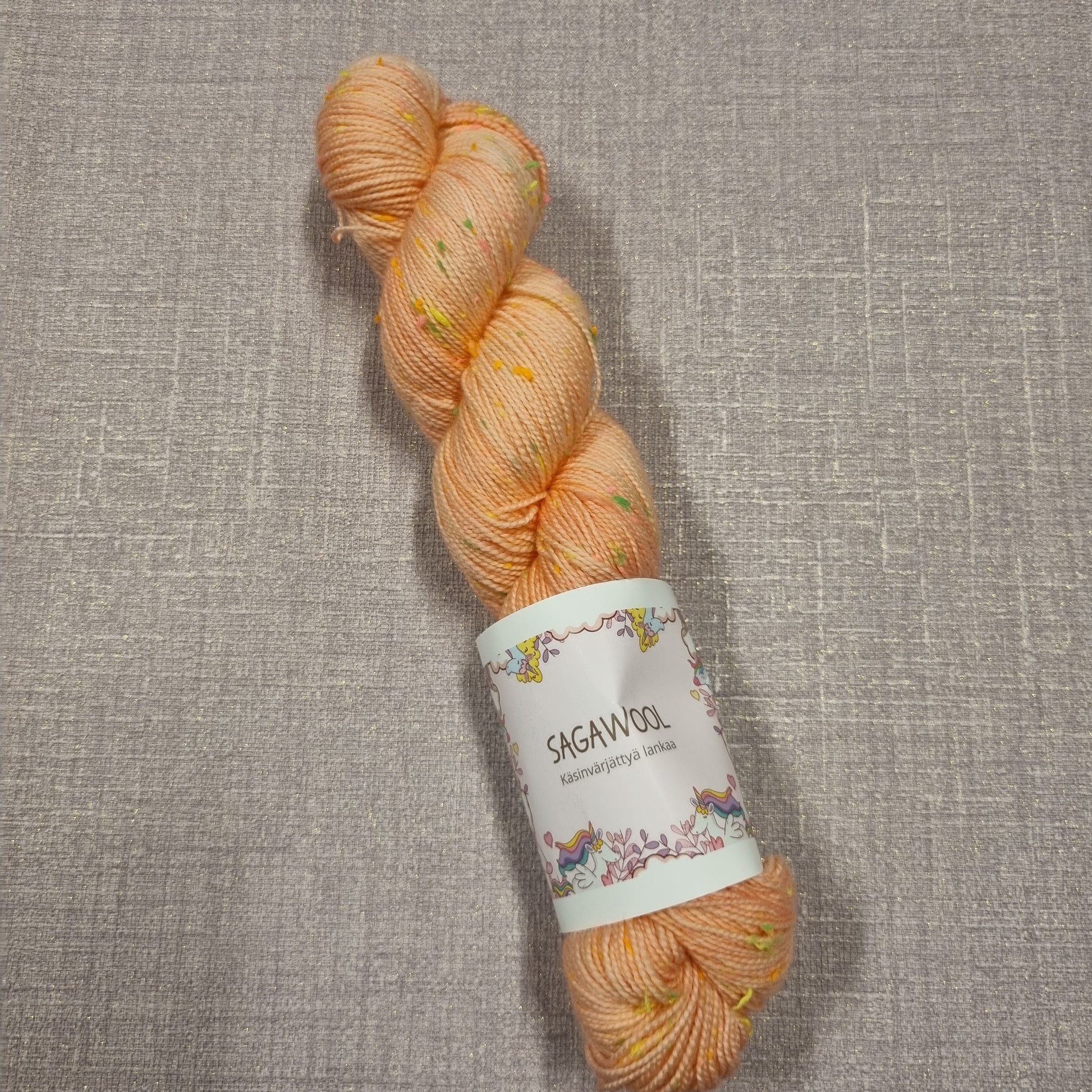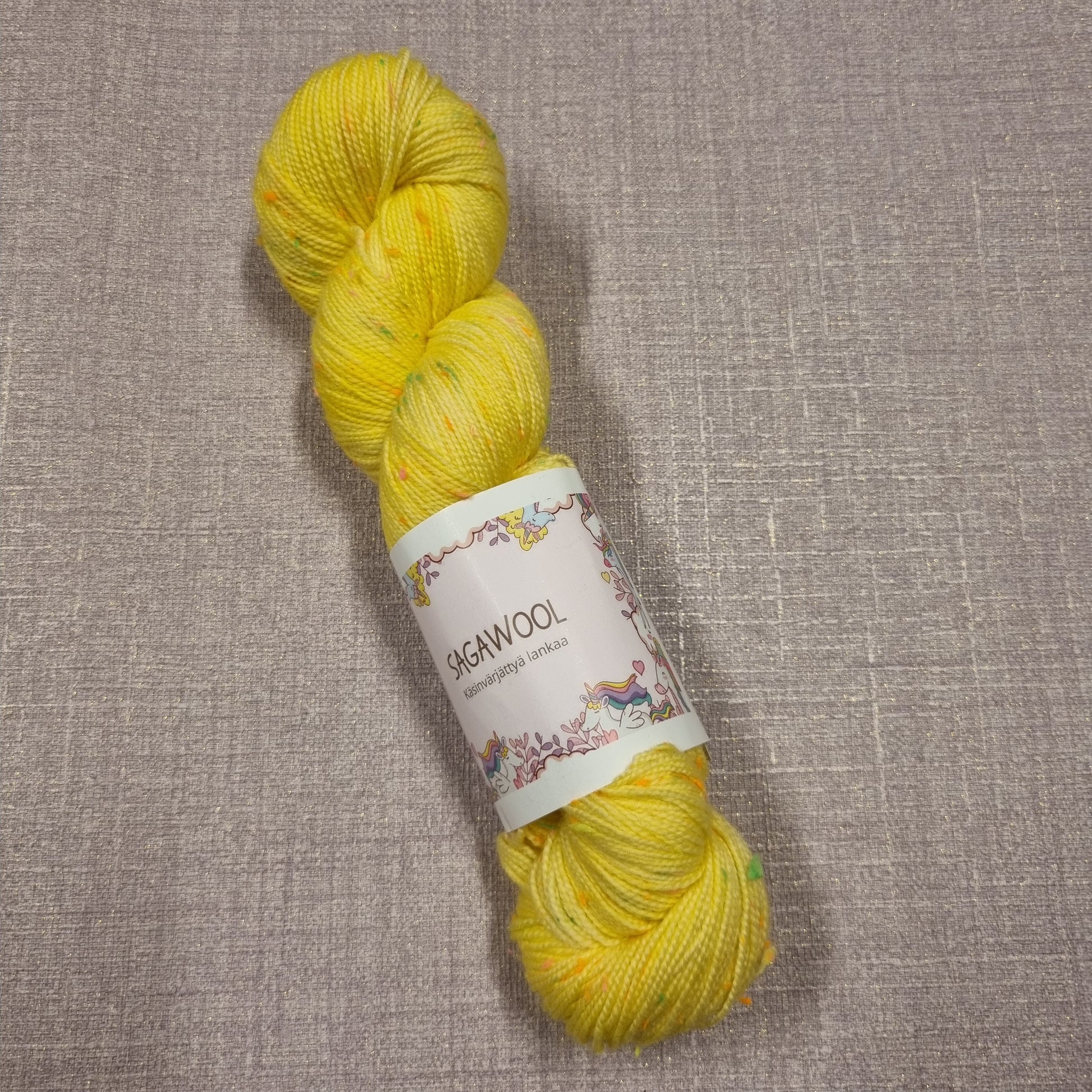 Neon nypyillä varustettu merinolanka. Tämä lanka on hieman erikoinen sillä nypyt hohtavat uv-valossa. Lanka tiukkakirteinen, helposti neulottava.
