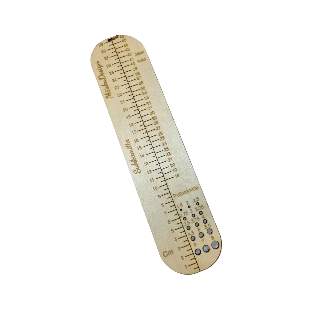 Tämä sukkamitta on jokaisen neulojan oiva apuväline. Sen avulla on helppo mitata sekä jalan koko että missä vaiheessa sukka on riittävän iso. Laita sukka kantapäästä mittaan ja kun puuttuu noin 3-4 cm verran valmiista pituudesta, voit alkamaan kaventamaan. Huomaa, että tähän vaikuttaa langan koko, käsiala ja kavennustekniikka. Sukkamitta toimii myös viivoittimena ja puikkomittana